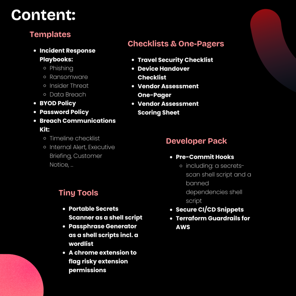 Ship security fast without the fluff. This all-in-one bundle gives small teams, businesses, and security pros everything they need to stand up practical policies, incident response, developer guardrails, and everyday tools—ready to use, easy to customize.